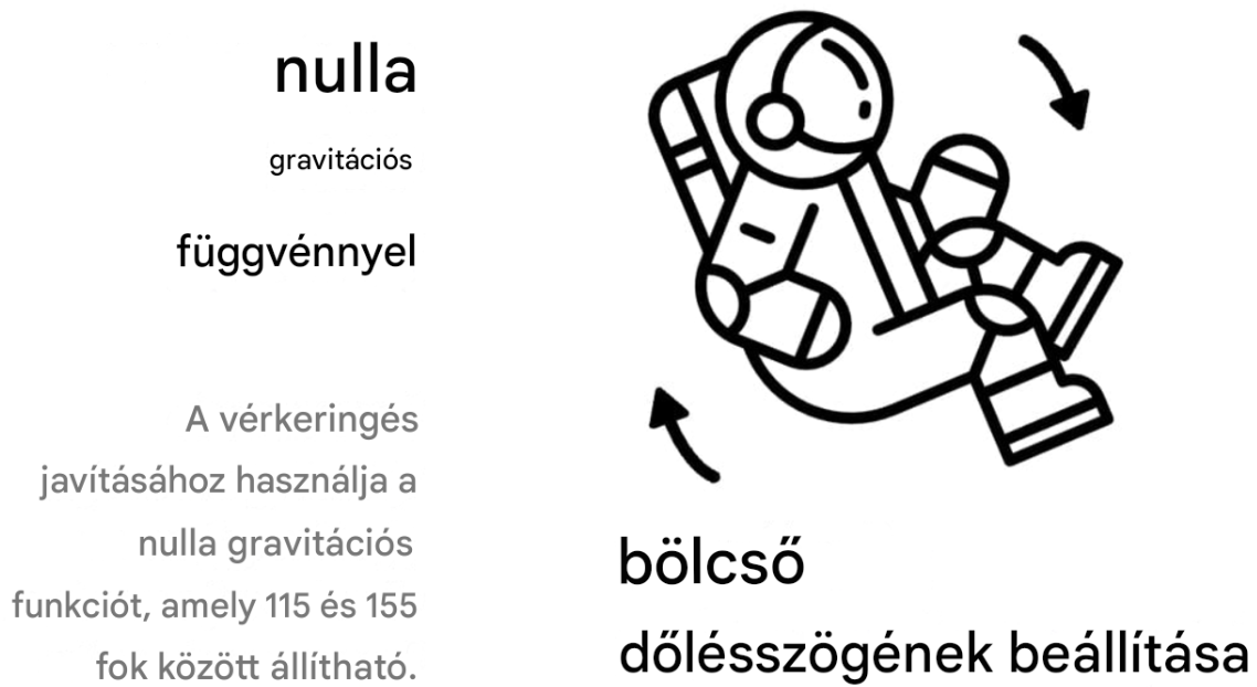 A ZERO GRAVITY mód kiválasztása a széket az űrhajós rakétaindítás közbeni testhelyzetéhez igazítja , minimalizálva a gravitáció testre gyakorolt hatását. Ebben a pozícióban a testsúly egyenletesen oszlik el az egész ülésen , jelentősen csökkentve a gerincre nehezedő nyomást, ellazítva az izmokat, és elősegítve a jobb vér- és nyirokkeringést. Ez a masszázs szempontjából a legelőnyösebb pozíciónak számít , amely maximális ellazulást és kényelmet biztosít.