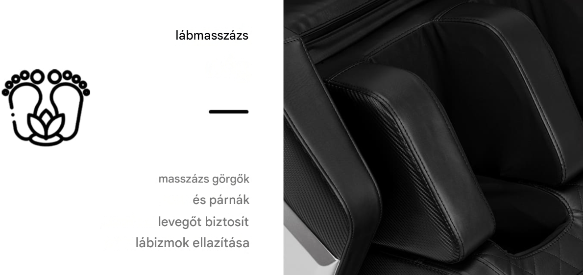 A fejlett masszázsmechanizmus hatékonyan ellazítja az izmokat , többféleképpen is kifejtve hatását. Nyolc fej masszírozza precízen a hátat, a combokat és a feneket , utánozva a manuális masszázstechnikákat – a gyúrást és a nyomást. Ez a kezelés javítja a test általános közérzetét, segít enyhíteni a fájdalmat és csökkenteni az izomfeszültséget . Minden egyes kezelés után jelentős izomfeszültség-csökkenést fog tapasztalni, így a test ellazultnak és nyugodtnak érzi magát. Ezenkívül a beépített lábmasszírozó akupresszúrát alkalmaz , hatékonyan ellazítja a fáradt izmokat, megszünteti a nehézség érzését és elősegíti az általános jólétet .