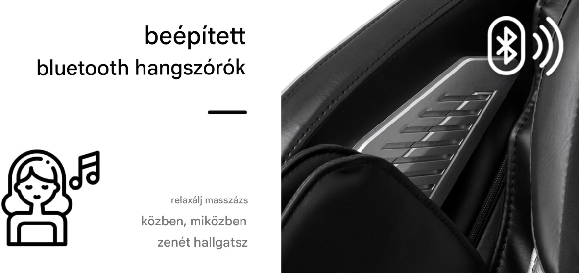A beépített Bluetooth funkciónak köszönhetően a széket csatlakoztathatod mobileszközödhöz, és a masszázs alatt lejátszhatod kedvenc zenéidet . A nyugtató hangok elősegítik a relaxációt, javítják a hangulatot, és lehetővé teszik, hogy elszakadj a mindennapi ingerektől. A masszázs és a hangterápia kombinációja elősegíti a mély nyugalmat és a test, valamint az elme regenerálódását.