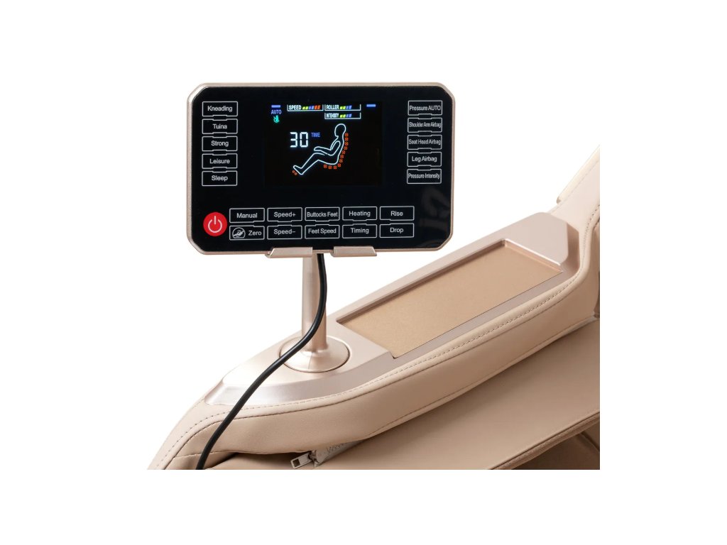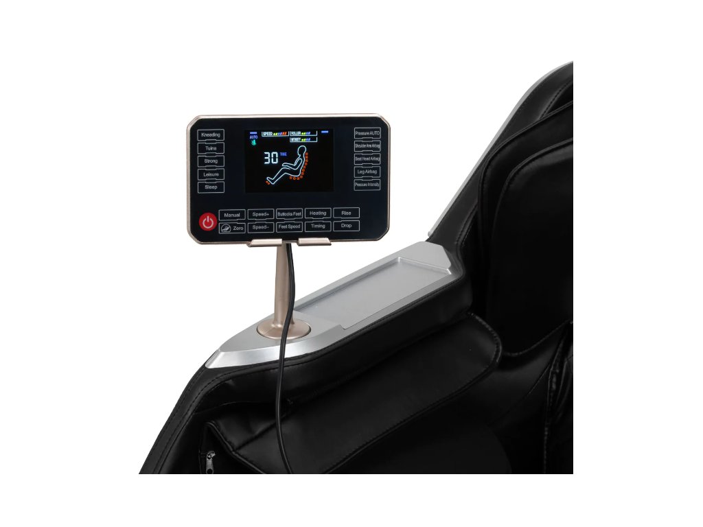 Az áttekinthető kezelőpanel és az olvasható LCD-képernyő biztosítja a szék intuitív kezelését. Kényelmesen elhelyezhető a jobb oldali kartámaszon lévő tartóban, vagy kézben tartható. A kijelző információkat jelenít meg az aktuálisan masszírozott testrészről, a masszázs intenzitásáról , a kezelés időtartamáról és a kiválasztott programról. A panel segítségével könnyedén beállíthatja a szék pozícióját, kiválaszthatja a kívánt masszázsmódot, és beállíthatja a kezelési időt – 15, 20, 25 vagy 30 perc .