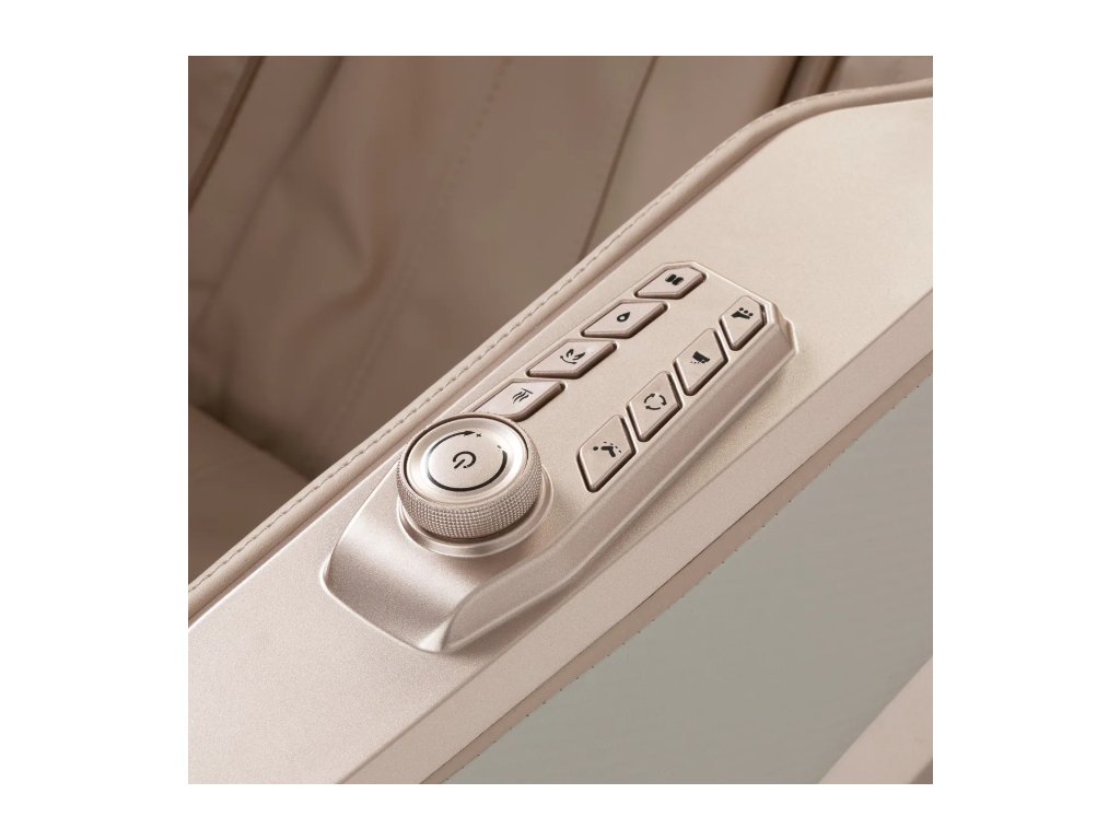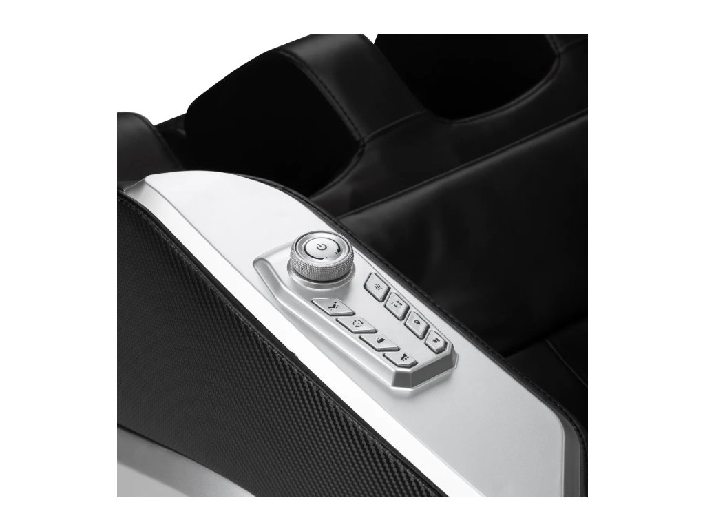 A még nagyobb kényelem érdekében a szék bal oldali kartámaszán egy további vezérlőgomb-készlettel rendelkezik . A beépített, praktikus távirányító gyors hozzáférést biztosít a kulcsfontosságú funkciókhoz anélkül, hogy a fő panelhez kellene nyúlni . A felhasználók könnyen válthatnak a masszázs típusa között, elindíthatják a lábmasszázst és aktiválhatják a nulla gravitáció funkciót – mindezt a maximális kényelem és relaxáció szem előtt tartásával.