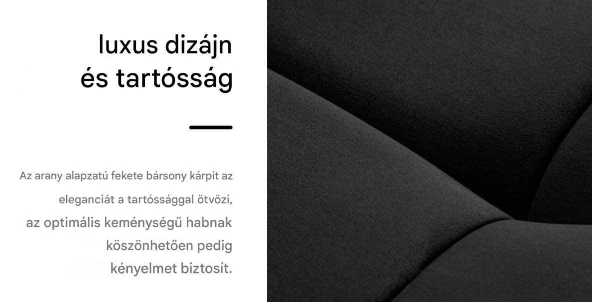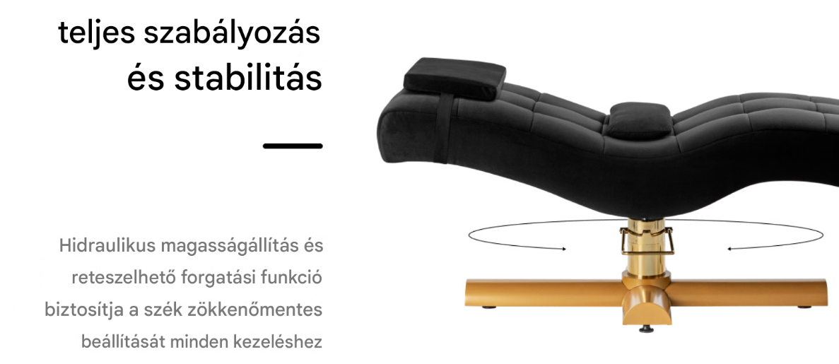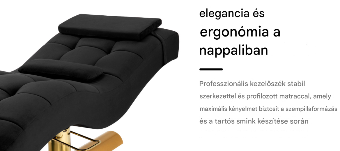 A kezelőszék optimálisan kemény habbal van töltve , amely tökéletes egyensúlyt biztosít a puhaság és a stabil testtartás között. A fekete bársony kárpitozás hangsúlyozza a berendezés elegáns és professzionális jellegét . Az arany árnyalatú tömör fém alap tartósságot és biztonságos használatot biztosít , míg a steppelt varrás és a klasszikus színkombináció luxus, időtlen jelleget kölcsönöz az egész széknek . A dizájn ötvözi az esztétikát a funkcionalitással, így a szék tökéletesen illeszkedik professzionális belső terekbe.