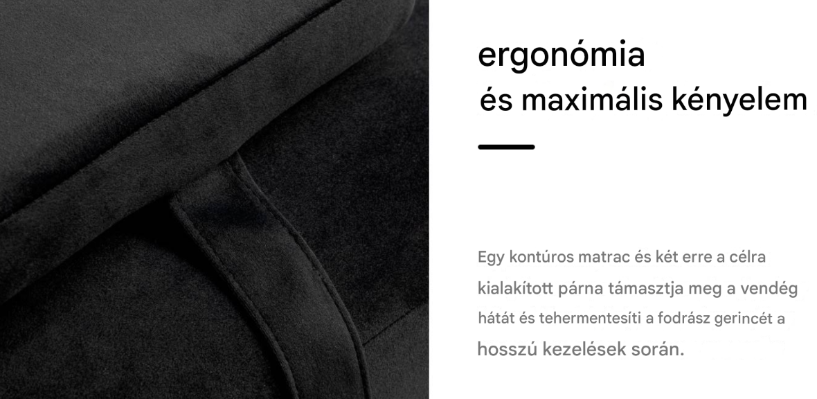 Az ergonomikusan kialakított matrac megtámasztja a hátat és elősegíti az izmok ellazulását , lehetővé téve a stabil, kényelmes testtartást a beavatkozás során. Az átgondolt kialakítás a szakember helyes munkatesttartását is támogatja , segítve a fáradtság csökkentését a hosszú kezelési órák alatt. A szett két párnát tartalmaz, amelyek fokozzák a test kényelmét , és lehetővé teszik a jobb testtartást, hogy megfeleljenek a kliens egyéni igényeinek.