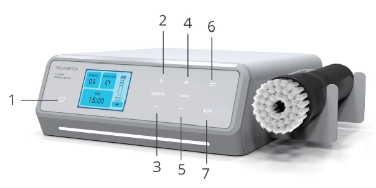 1. Helyezze be a forgókefét a készülék megfelelő aljzatába. A tápkábel megfelelő csatlakoztatása után a „Bekapcsoló” pirosan jelenik meg. Nyomja meg a „Bekapcsoló” gombot a működési módba való belépéshez, és a képernyő fehéren jelenik meg. A készülék alapértelmezés szerint működési állapotba kapcsol; ezért az 1. szint kimeneti teljesítménye 15 percre van beállítva.
