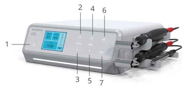 1. Helyezze be a galvánszondát a készülék megfelelő aljzatába. Miután a készülék megfelelően csatlakoztatva van a tápkábelhez, a „Bekapcsoló” pirosan jelenik meg. Nyomja meg a „Bekapcsoló” gombot a működési módba való belépéshez, és a képernyő fehéren jelenik meg. A készülék alapértelmezés szerint a szemszonda kimenetére van beállítva; ezért az 1. szint kimeneti energiája 15 percre van beállítva.