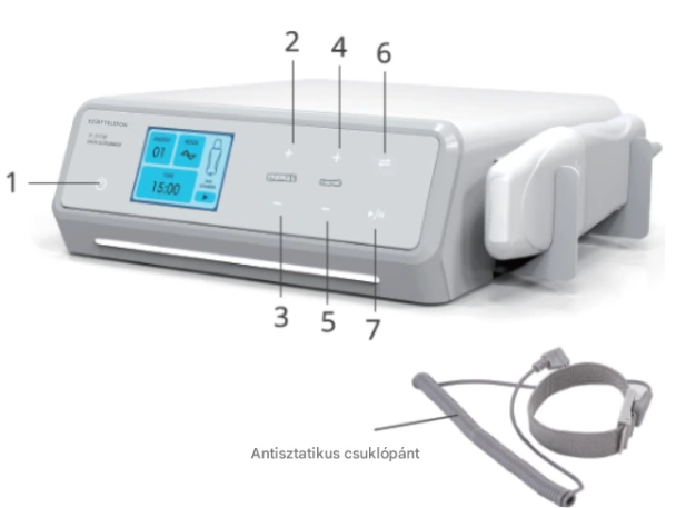 7. A kezelés befejezése után nyomja meg a bekapcsológombot a készülék kikapcsolásához. A bekapcsológomb ekkor pirosan világít. Miután kihúzta a csatlakozódugót a konnektorból, tisztítsa meg a spatulát és az antisztatikus csuklópántot 75%-os alkohollal, és tárolja száraz helyen.