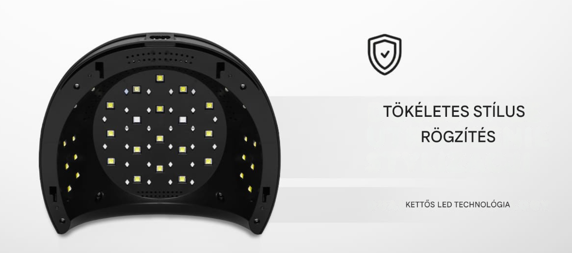 42 gondosan elhelyezett LED biztosítja a gélek és hibrid körömlakkok tökéletes kötést – holt zóna nélkül. A modell kialakításának középpontjában álló zárt forma, vagy fülke , lehetővé teszi a körömminták pontosabb és gyorsabb kötést . A kettős LED technológia lehetővé teszi, hogy a diódák két hullámhosszon bocsátsanak ki fényt, csökkentve a szem megerőltetését és széles hatásspektrumot biztosítva a készüléknek . A gondosan kiválasztott megoldások megkönnyítik még a legigényesebb termékek megfelelő kötést is, lehetővé téve a körömlemez legnehezebben elérhető területeinek elérését .