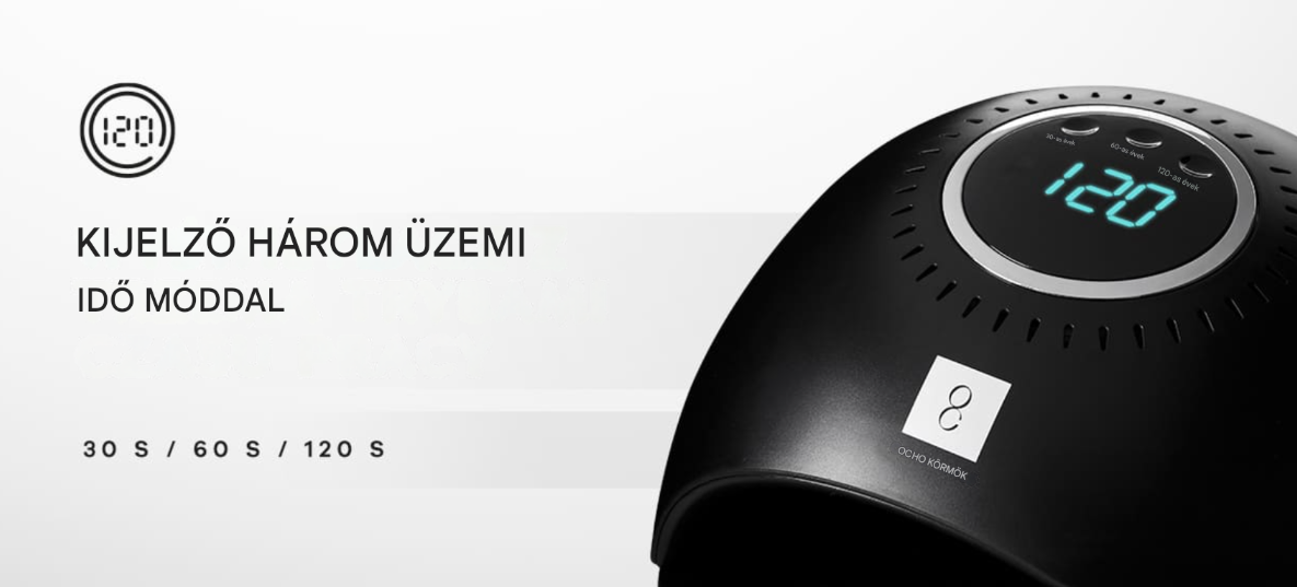 A lámpa időzítővel van felszerelve, három előre programozott működési idővel : 30 másodperc, 60 másodperc és 120 másodperc ("Alacsony hőmérsékletű mód"), amelyeket egy jól olvasható digitális kijelzőn számolnak vissza. A beépített mozgásérzékelő automatikusan bekapcsolja a lámpát, amikor az ujját vagy a lábujját aláhelyezi, fenntartva a maximális 120 másodperces expozíciós időt. Ez a funkció akkor működik, ha nincs kiválasztva üzemmód, és a kijelzőn az eltelt szárítási idő látható . Ez lehetővé teszi, hogy szabadon megválaszthassa az expozíciós hosszt az alkalmazott formázás alapján. Ezenkívül a fent említett "Alacsony hőmérsékletű mód" kiválasztásával a lámpa lassabban melegszik fel a formázás során , fokozatosan növelve a teljesítményét. Ez megakadályozza az égő vagy forró érzést a szárítási folyamat során. Ez egy nélkülözhetetlen funkció, különösen gélek szárításakor , ami gyakran kellemetlenséget okoz a piacon kapható más lámpák használatakor.
